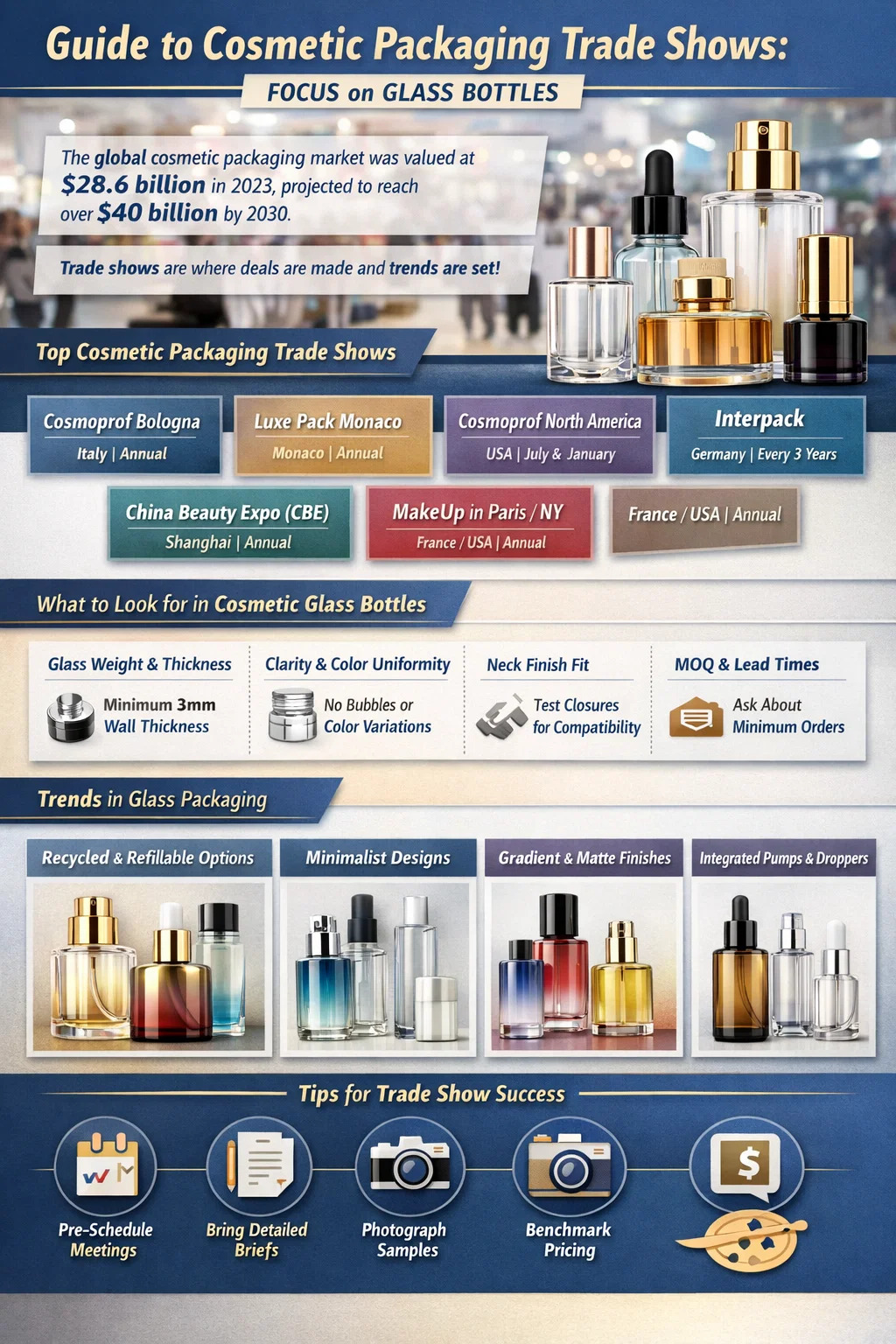 Kozmetik ürünler için ambalaj tedarik ediyorsanız, özellikle de birinci sınıf malzemeler kozmetik cam şişeler — Doğru ticari fuarlara katılmak, verebileceğiniz en etkili kararlardan biridir. Tek bir yerde yüzlerce tedarikçiyi karşılaştırabilir, fiziksel numuneleri ele alabilir, doğrudan fiyatlandırma üzerinde pazarlık yapabilir ve e-posta yoluyla destek yoluyla çoğaltılması aylar süren ilişkiler kurabilirsiniz. Küresel kozmetik ambalaj pazarı yaklaşık olarak değerlendi. 2023'te 28,6 milyar dolar Grand View Research'e göre 2030 yılına kadar 40 milyar doların üzerine çıkması bekleniyor. Ticari fuarlar bu pazarın önemli bir bölümünün şekillendiği yerlerdir; anlaşmalar yapılır, trendler belirlenir ve tedarikçi ağları oluşturulur.