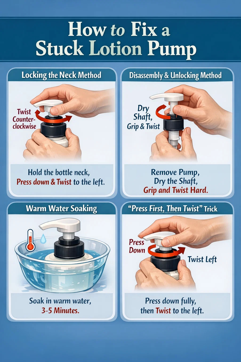 Bu en yaygın ve etkili yöntemdir. Çoğunlukla losyon pompası açılmaz çünkü üst pompa kafasını çevirdiğinizde alttaki şişe kapağı da dönerek kuvveti ortadan kaldırır.