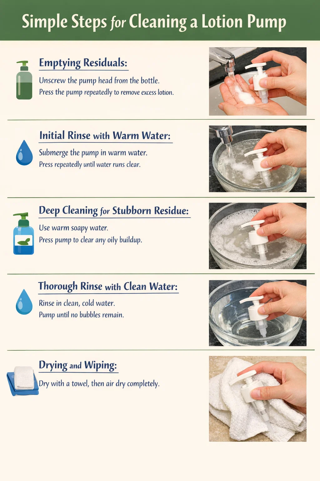 Losyon pompasının temizlenmesi aslında oldukça basittir. Doğru yöntemle kalan ürünü kolayca temizleyebilir, temizliği sağlayabilir ve ileride kullanmak üzere tıkanmaların önüne geçebilirsiniz.