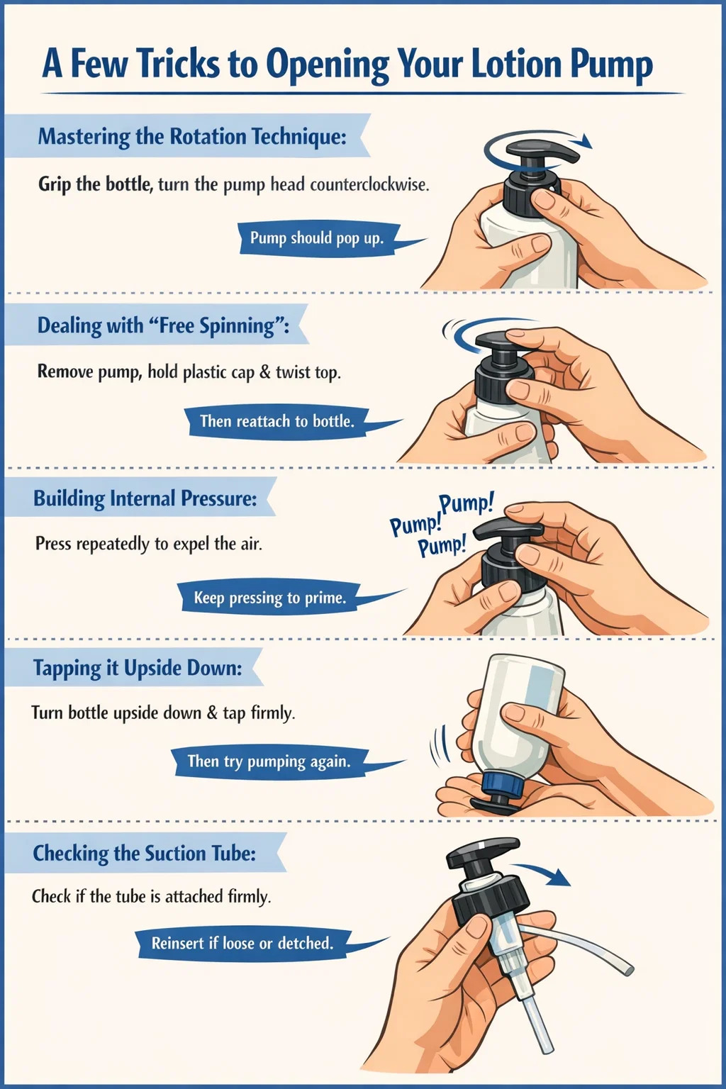 Yeni satın alınan cilt bakım ürünleriyle ilgili en sinir bozucu şey çoğu zaman yerinden kıpırdamayan losyon pompasıdır. Aslında bu pompa kafaları sızıntıyı önlemek için fabrikada özel bir kilitleme mekanizmasıyla tasarlanmıştır.