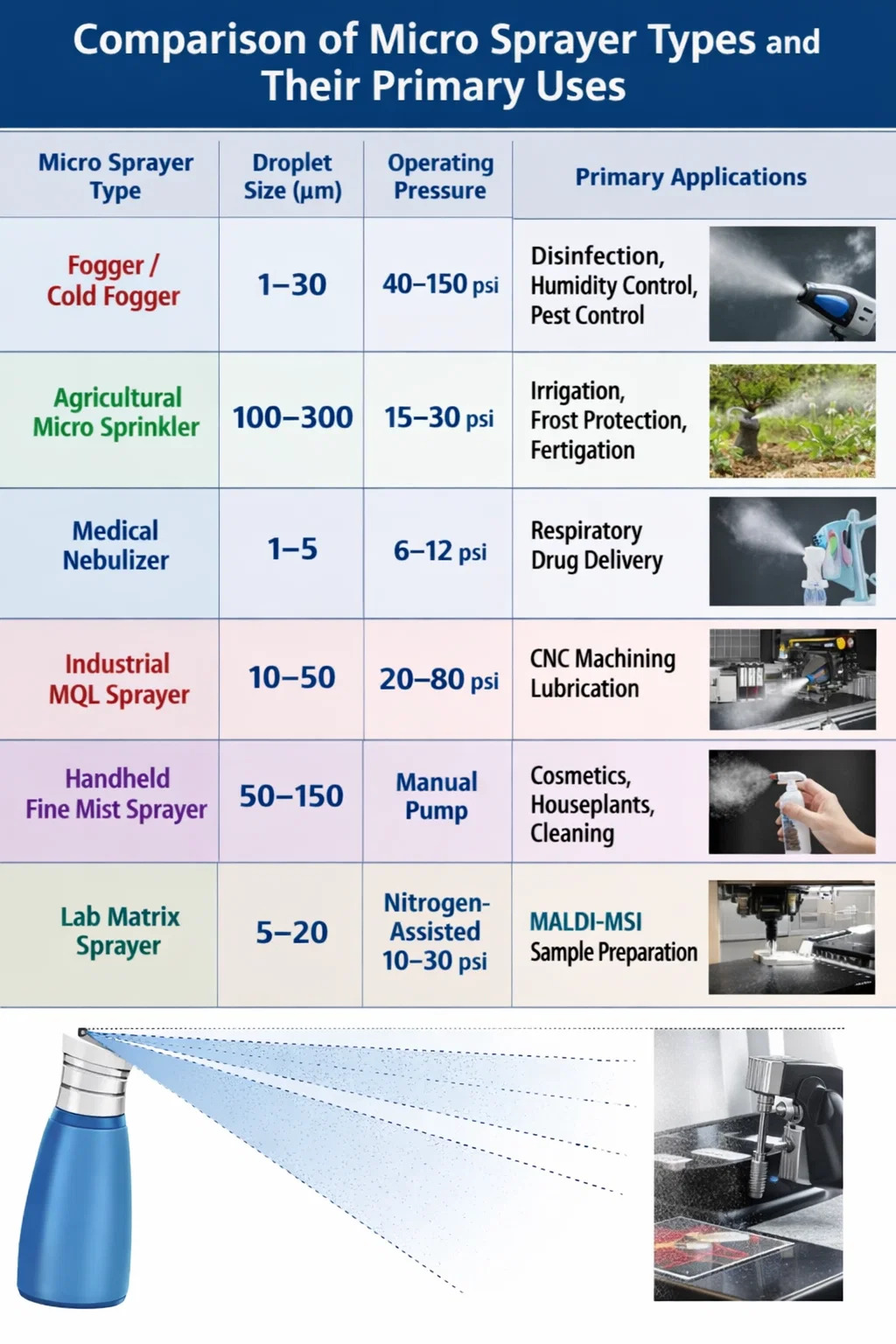 Farklı mikro püskürtücü konfigürasyonları belirli uygulamalar için optimize edilmiştir. Yanlış türün seçilmesi, kapsamın yetersiz olmasına, malzeme israfına veya ekipmanın hasar görmesine neden olur. Aşağıdaki tablo en yaygın mikro püskürtücü türlerini, bunların tipik damlacık boyutlarını, çalışma basınçlarını ve en iyi kullanım durumlarını özetlemektedir.