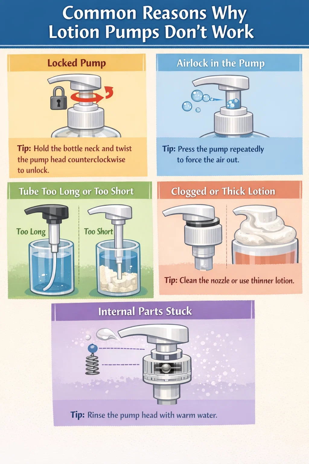 Basit açıklaması: Uzun süre kullanılmayan losyon pompalarında, ağızlıkta kalan az miktardaki krem kalıntısı kuruyup sertleşerek çıkışı tıkayabilir. Ayrıca losyonunuz dondurma kadar koyuysa ve pompanın emiş gücü yeterince güçlü değilse, sıvıyı tüpten yukarı çekemeyecektir.